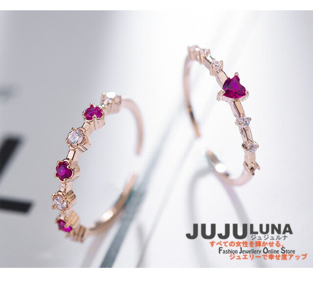 リング シンプル 2連 カワイイ ルビー色 ハート 極細 人気 CZダイヤ フリーサイズ 結婚式 パーティー カジュアル 大人可愛い 女性 アクセント トレンド デイリー ジュエリー アクセサリー ジュジュルナ jujuluna